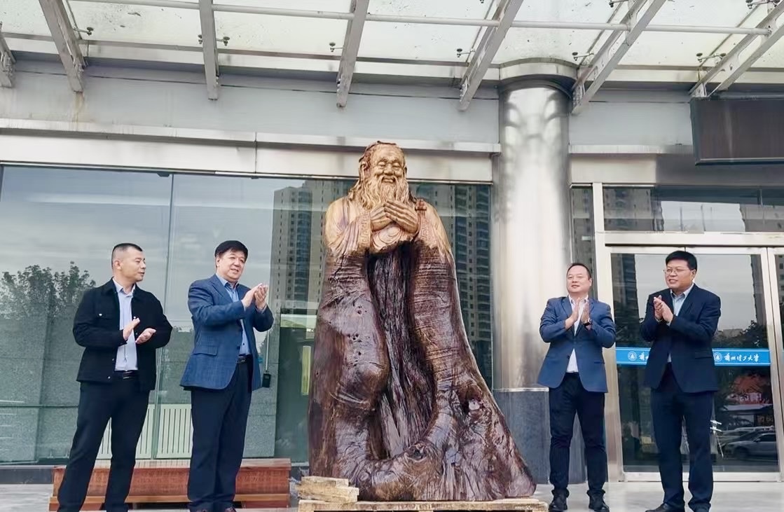 卢少卿在敦雅楼前为木质孔子像揭幕,这尊由MBA校友会捐赠的雕像,既是对“万世师表”的致敬,也承载着尊师重道的育人初心,为校园增添了厚重的人文气息。