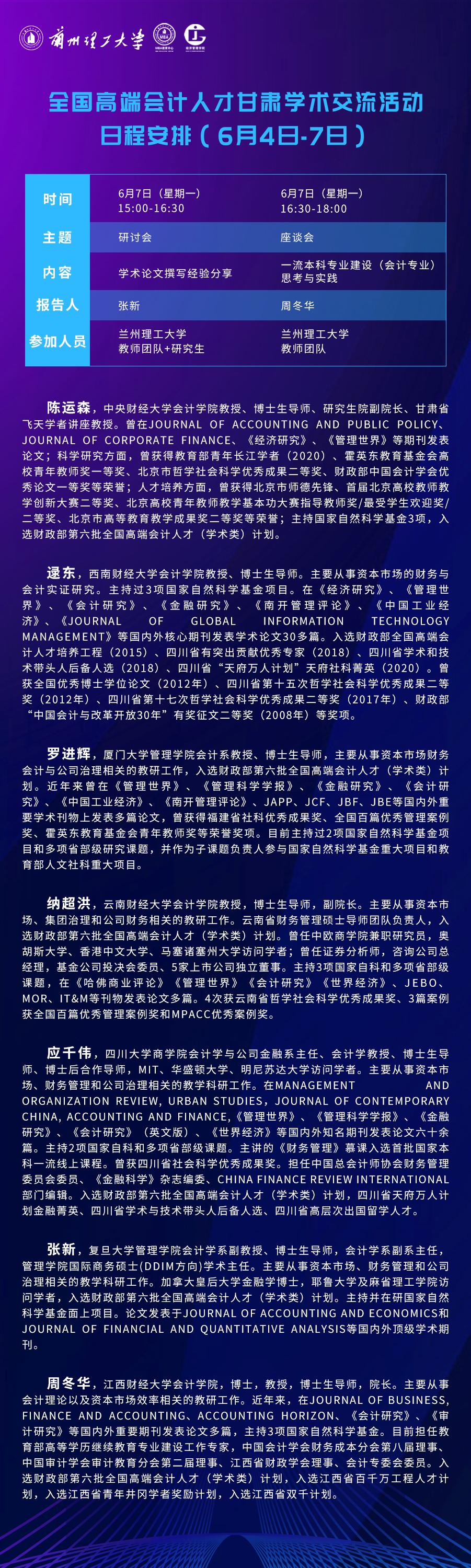 2021年6月5日至7日,由中央财经大学会计学院教授、博士生导师、教育部青年长江学者陈运森教授带队的7位全国高端会计人才(学术类第六期)来甘肃进行学术交流,指导甘肃高校会计学学科、国家一流本科专业和一流课程建设。我校经管学院师生参加了此次学术交流活动。