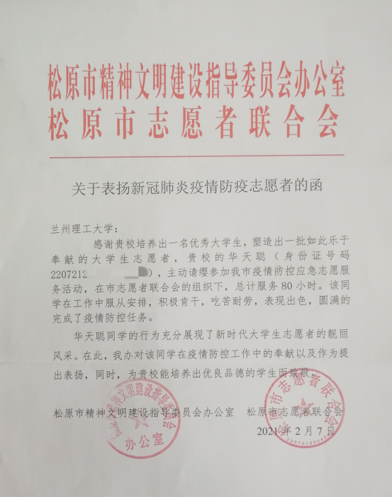前不久,兰州理工大学收到了一封来自吉林省松原市的表扬函,这是松原市精神文明建设指导委员会联合松原市志愿者联合会发来的,表扬函对学校经济管理学院华天聪同学“在疫情防控工作中的奉献以及作为提出表扬”。