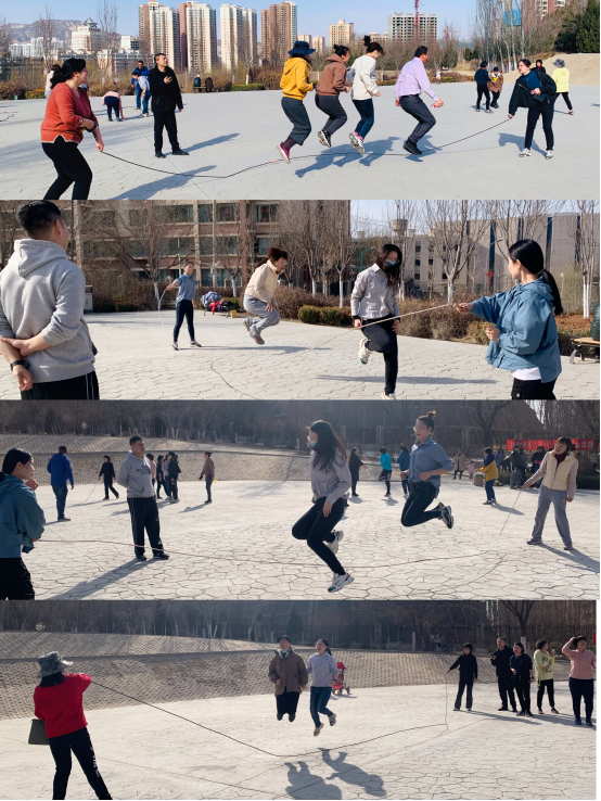5人一组互相配合、共同完成的齐心协力跳大绳