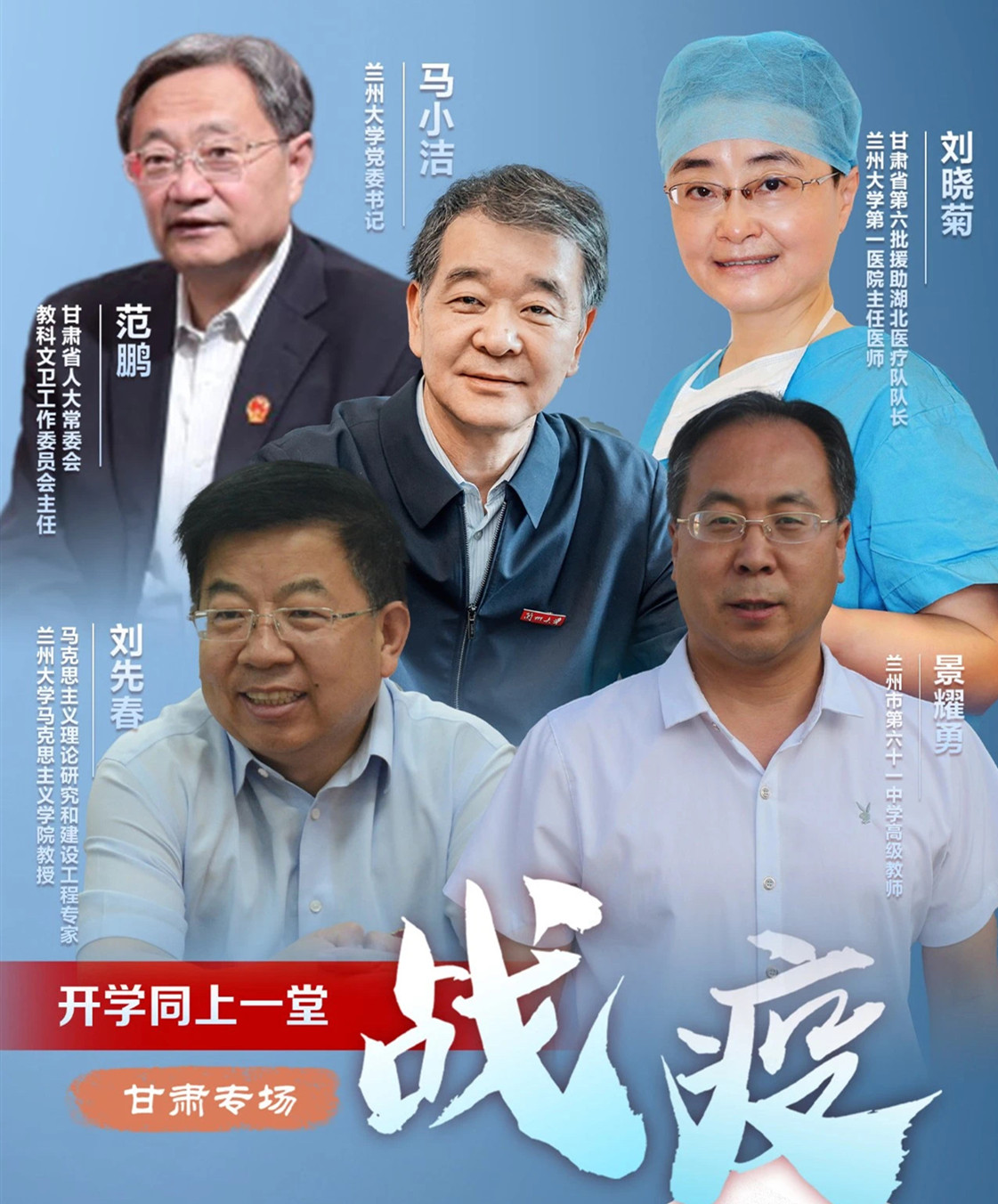 新冠肺炎疫情发生以来,甘肃省派出6批医疗队和2支疾控队,与全国各地、各部门戮力同心、全力奋战。疫情防控是一场没有硝烟的战争,更是一堂鲜活生动的思政大课。这次“同上一堂战‘疫’思政大课”甘肃专场,邀请了兰州大学党委书记马小洁,甘肃省人大常委会教科文卫工作委员会主任范鹏,马克思主义理论研究和建设工程专家、兰州大学马克思主义学院教授刘先春,甘肃省第六批援助湖北医疗队队长、兰州大学第一医院主任医师刘晓菊,兰州市第六十一中学高级教师景耀勇作为主讲嘉宾。他们结合疫情防控,分析疫情防控过程中彰显出的中国共产党领导和中国特色社会主义制度的显著优势,引导大家正确认识和看待此次疫情,树立责任担当意识,激发爱党爱国爱社会主义的深厚情怀。