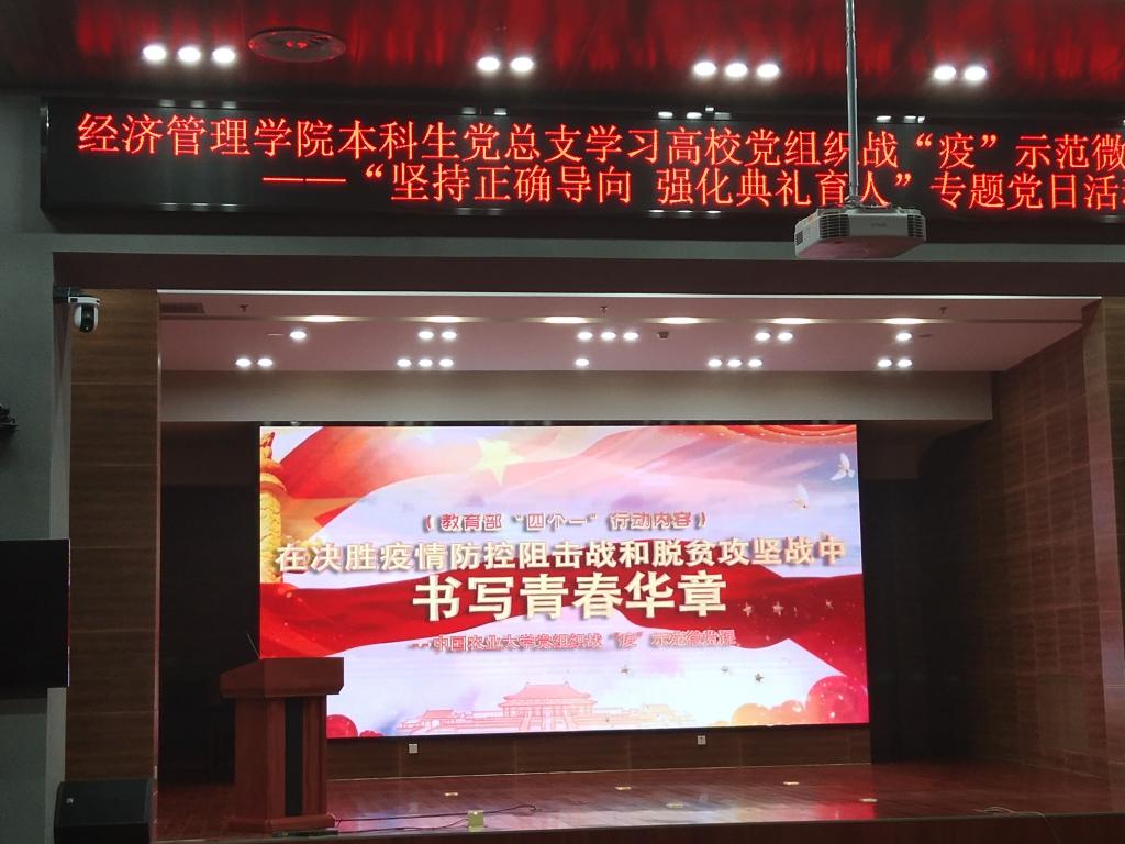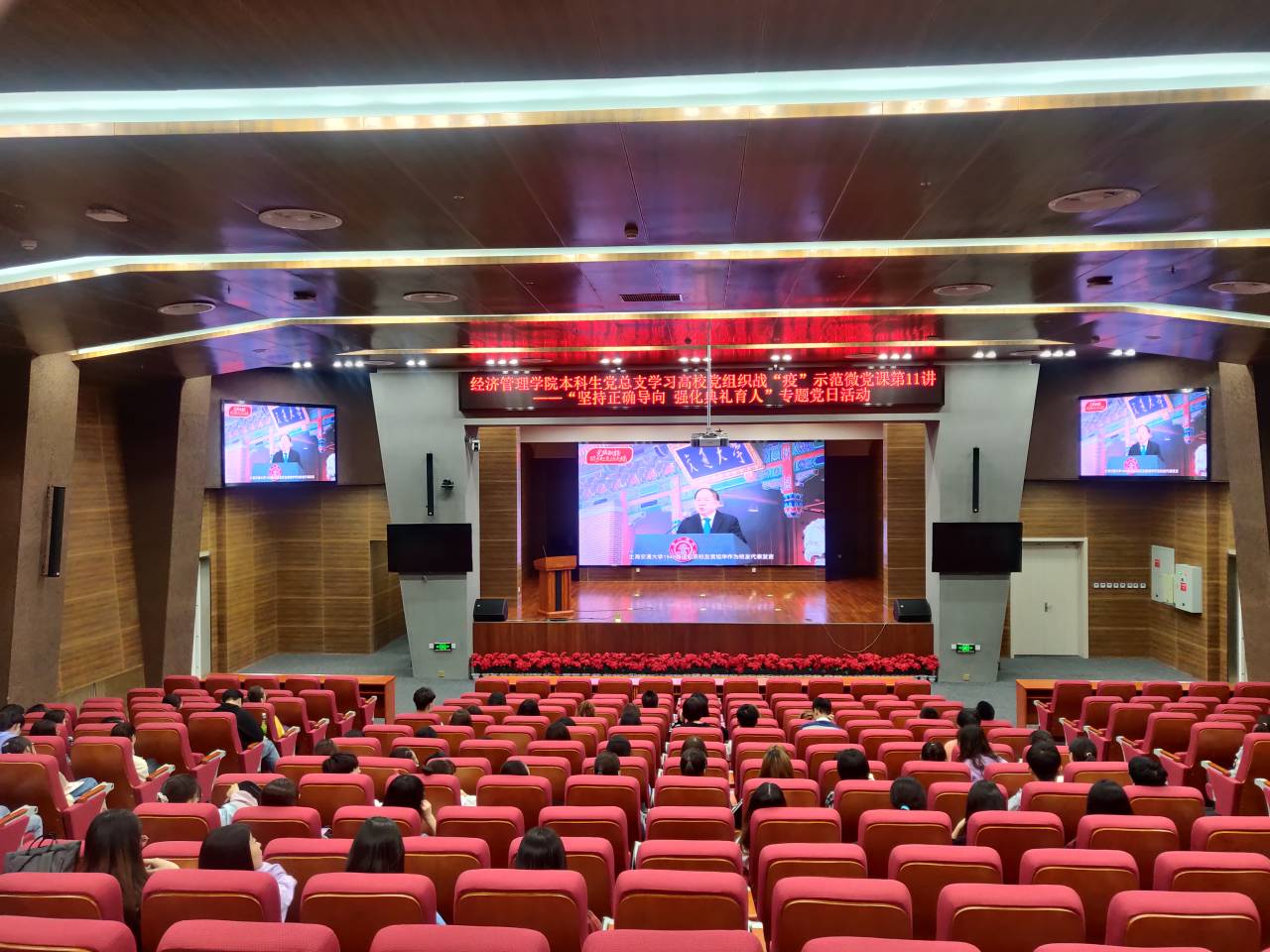 2020年9月4日晚,兰州理工大学经济管理学院会计学本科生第二支部于彭家坪校区图书馆106报告厅组织全体党员认真收看了教育部“党旗飘扬,筑牢红色防火墙”高校党组织战“疫”示范微党课第十一讲“坚持正确导向,强化典礼育人”专题讲座。
