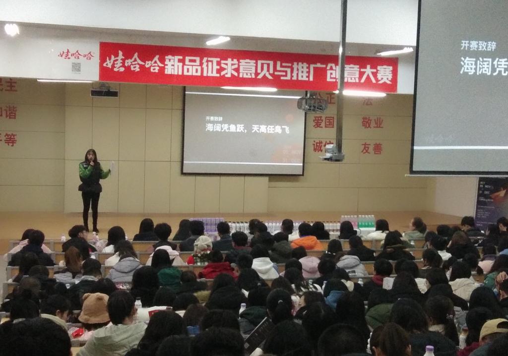 大会首先由娃哈哈公司拓展总监俞小华女士介绍了杭州娃哈哈公司举办活动的大概情况,包括正在进行的娃哈哈新品征求意见与推广创意大赛的大概情况和市场营销俱乐部的市场营销大赛在兰州理工大学历年举办情况。其次,市场营销俱乐部会长姚文龙同学代表本次活动负责方发言,对主推产品的概念、定位、工艺、等各个方面做了解读。最后,娃哈哈公司拓展部经理穆燕女士介绍了娃哈哈新品征求意见与推广创意大赛的具体参赛内容。她介绍到创意大赛将围绕娃哈哈2020年的6款重推新品展开,有包装设计建议大赛、产品改进建议大赛、产品广告策划大赛、产品抖音视频大赛、广告模特竞选等五项赛事。