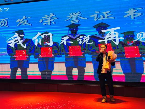同学们自编自导自演,给大家带来一次视觉盛宴。“莫愁前路无知己,天下谁人不识君”。2022级1、2班毕业生全体先后登台,带来手势舞《太阳下有月光》、合唱《再见》,3班同学带来诗朗诵。