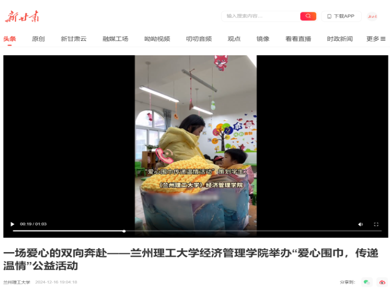 经济管理学院11月-12月举办了“爱心围巾,传递温情”公益捐赠活动,为山区孩子送去冬日的温暖与关怀,活动取得了良好的社会反响,“新甘肃”等媒体进行了宣传报道。