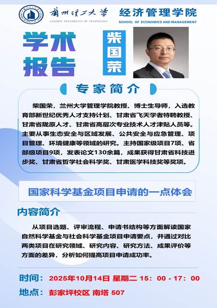 2025年10月14日下午,经济管理学院举办“2026年国家项目申报专题辅导”,特邀兰州大学管理学院柴国荣教授以《国家科学基金项目申请的一点体会》为题作报告,学院科研工作负责人、相关领导,拟申报2026年国家项目的部分教师以及研究生参加了讲座。