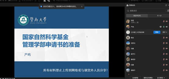 2025年11月5日下午,经济管理学院举办“2026年国家自科项目申报专题辅导”,特邀暨南大学管理学院严鸣教授以《国家自科基金申请书的准备》为题作报告,学院领导、拟申报2026年国家项目的部分教师以及研究生参加了讲座。