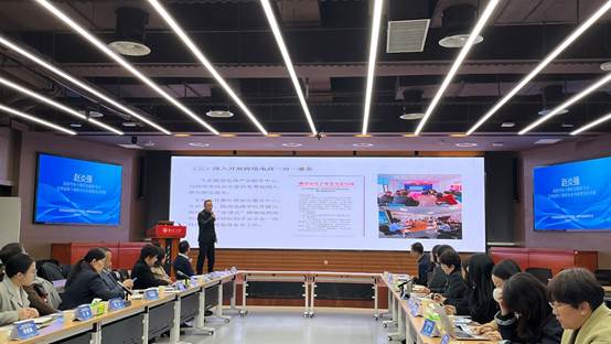 学院学术委员会主任张雪梅教授主持主题报告环节。陇南市电子商务发展局赵炎强科长以《西部山区跨境电商的破局之路——陇南市的探索与实践》为题,分享了陇南市在跨境电商领域的创新实践与典型案例。