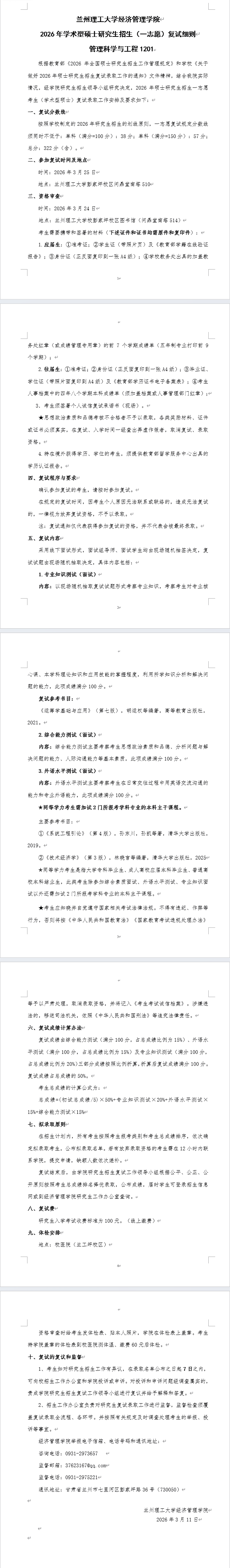 兰州理工大学经济管理学院 2026年学术型硕士研究生招生(一志愿)复试细则 管理科学与工程1201