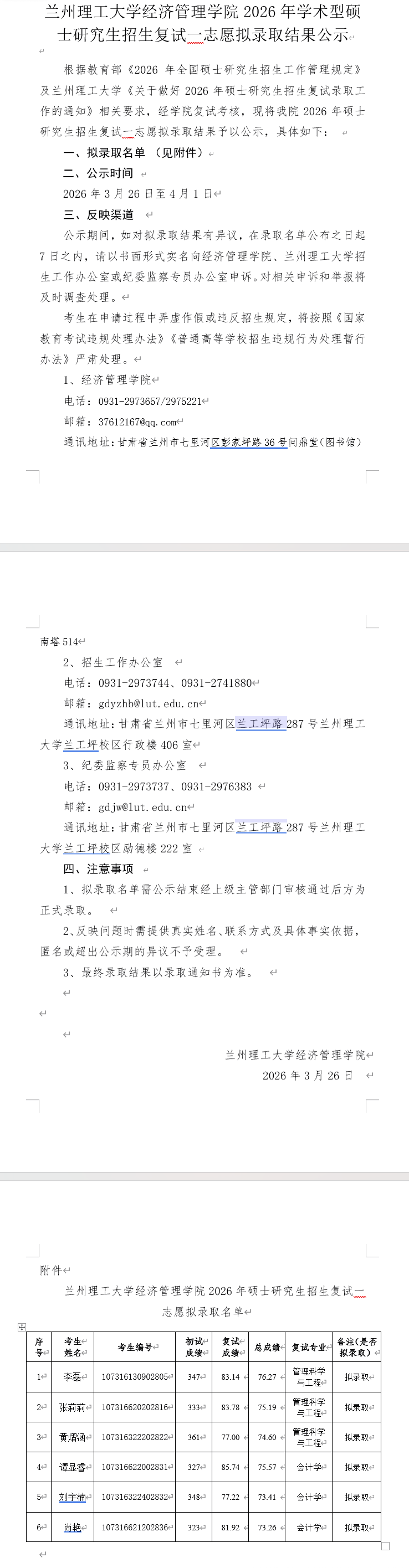 兰州理工大学经济管理学院2026年学术型硕士研究生招生复试一志愿拟录取结果公示